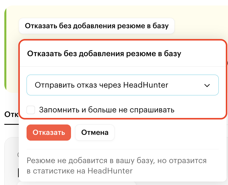 При обработке загруженных откликов можно отправлять кандидатам отказ через HeadHunter одновременно с отказом в Хантфлоу.