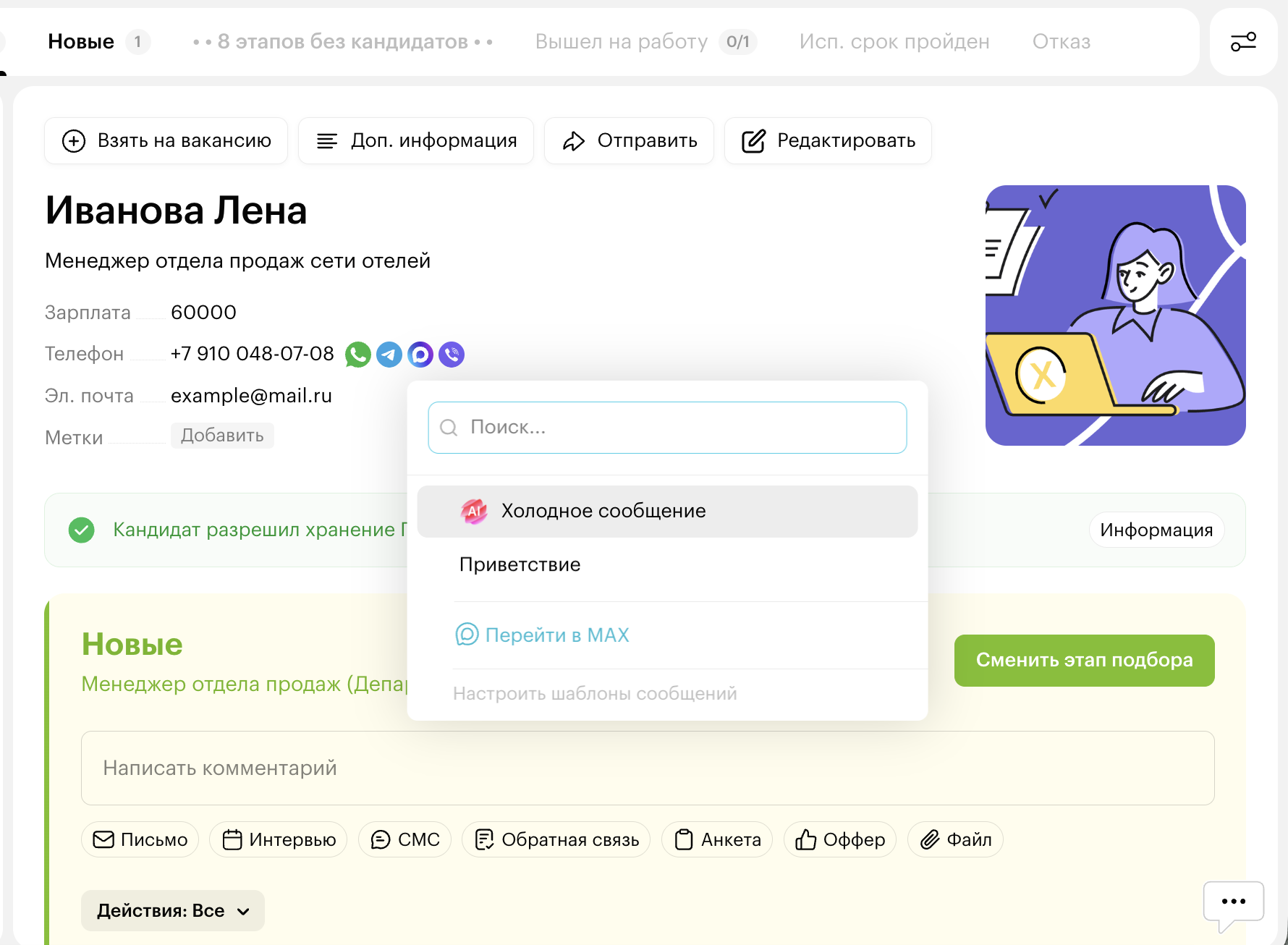 Теперь вы сможете переходить в чат с кандидатом напрямую из Хантфлоу: нажмите на логотип мессенджера MAX → выберите вакансию, шаблон или сразу нажмите «Перейти в MAX», если не нужно использовать шаблоны для мессенджеров.
