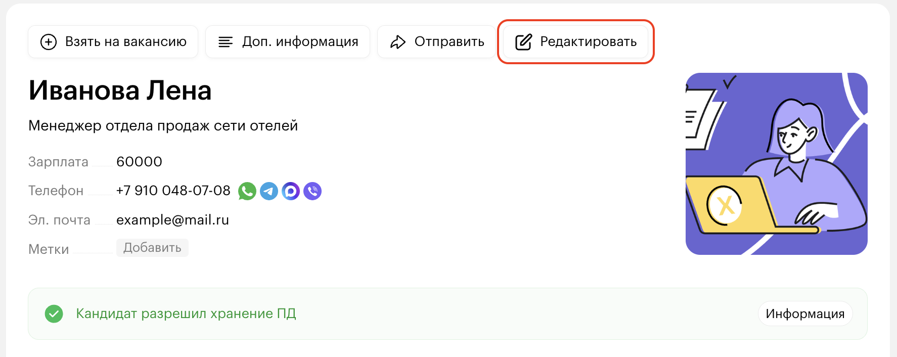 Рекрутер может добавить ссылку на профиль кандидата вручную: