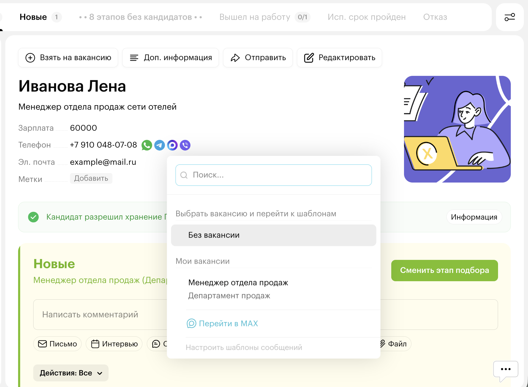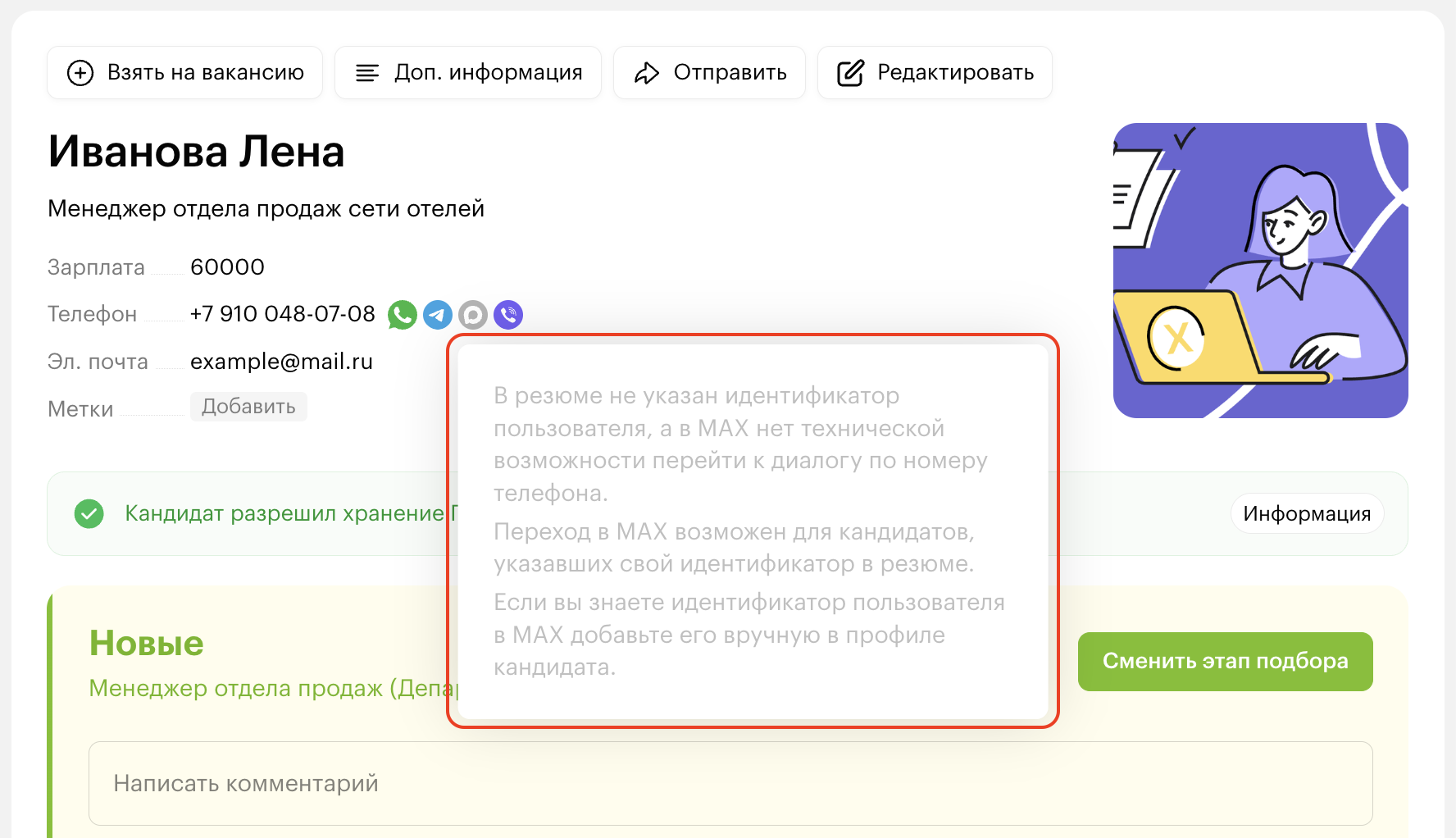 Чтобы общаться с кандидатами в мессенджере MAX, нужно, чтобы в карточке кандидата была добавлена ссылка на профиль кандидата в мессенджере.