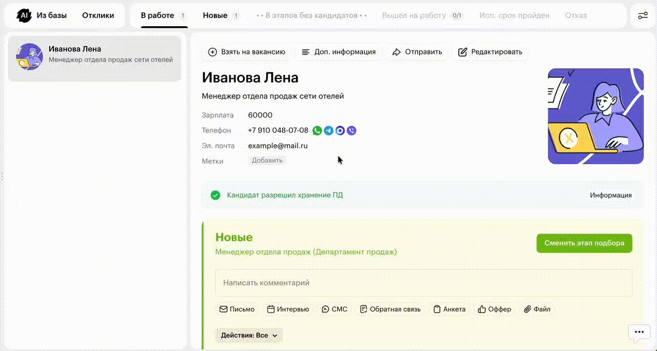 - Если в карточке кандидата указан его ник в мессенджере, то при переходе формируется ссылка формата t.me/nickname
