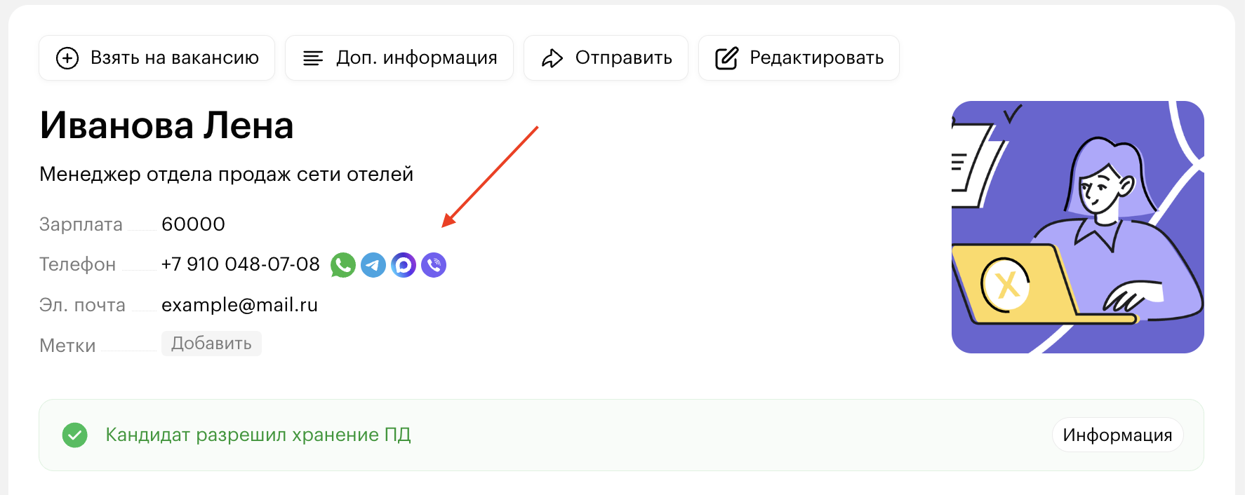 - Откройте карточку кандидата и нажмите на иконку нужного мессенджера, например, Телеграм, в шапке профиля рядом с номером телефона кандидата.