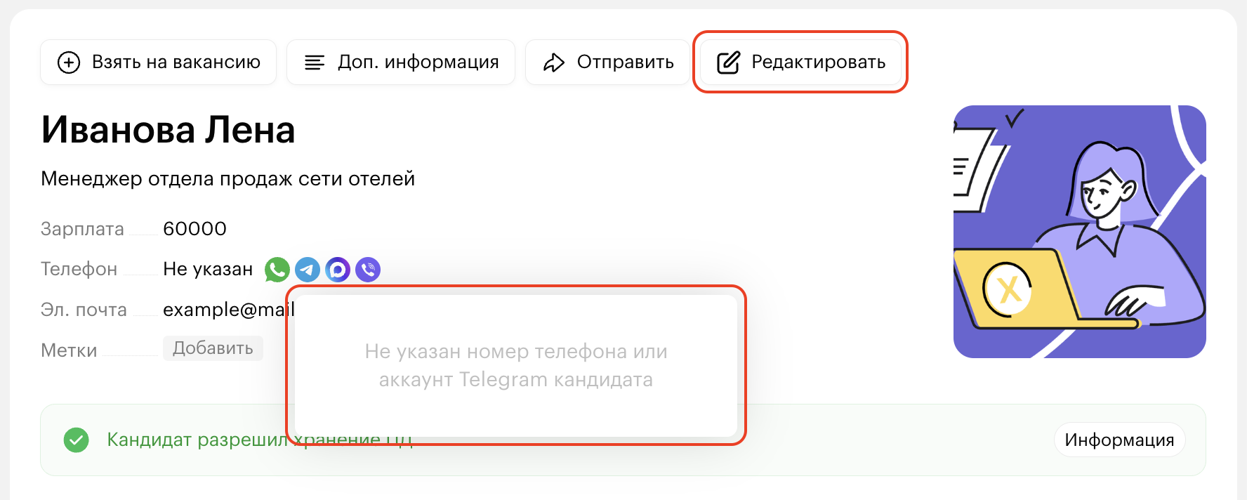 Если у кандидата не указан телефон или ник, вы увидите предупреждение о том, что эти данные не указаны. Скорректируйте карточку кандидата через кнопку «Редактировать» и добавьте номер телефона или ник, чтобы в дальнейшем ускорить переход в чат с кандидатом.