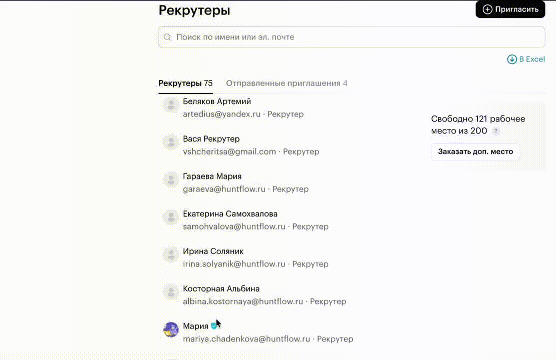 - Назначать рекрутеров на вакансии — рекрутер может прикреплять к вакансиям своих коллег-рекрутеров для совместной работы над вакансией.